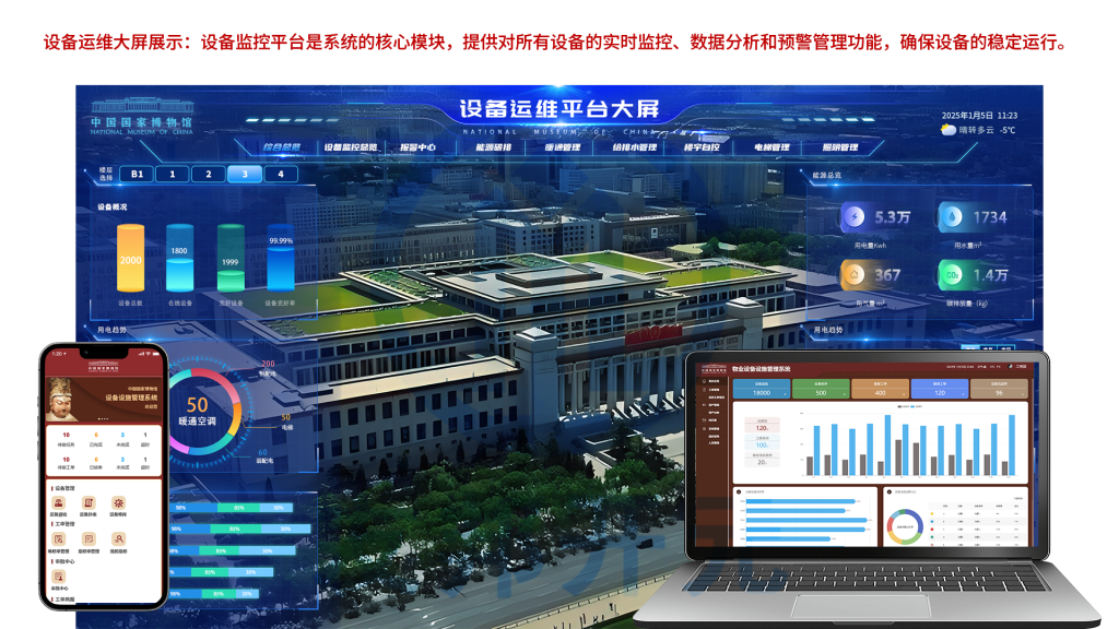 - 分散的各机电系统集成联动:接入博物馆内包楼宇自控、照明、电梯、等机电系统,监控设备的整体运行状态,包括各专业设备的接入数量、上线总数、能耗总体情况、设备告警数量及处理进展等,为设备管理人员提供实时的运行概览。